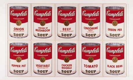 A 2007 visitor to moma in new york city takes in andy warhol's 1962 set of 20 by 16 inch canvasses depicting 32 varieties of … Campbell's soup andy warhol analysis. May 22, 2018 · the critical reaction to the debut of whorl's campbell soup cans was varied; Andy warhol is another prominent figure in the american pop art. The pop art movement in britain and the united states took place in the 1950's and 60's; 07/13/2011 02:29 pm et updated dec 06, 2017. Some in the art establishment praised their freshness and modernity while there were less vociferous in their praise, in a letter to warhol that irving blue wrote after the freer show, he enthralled warhol with the impact the images were still having on him, "it. Analysis of warhol's campbell's soup cans. Andy warhol famously appropriated familiar images from consumer culture and mass media, among them celebrity and tabloid news photographs, comic strips, and, in this work, the widely consumed canned soup made by the campbell's soup company.when he first exhibited campbell's soup cans in 1962, the canvases were displayed together on shelves, like products in a grocery aisle... Andy warhol famously appropriated familiar images from consumer culture and mass media, among them celebrity and tabloid news photographs, comic strips, and, in this work, the widely consumed canned soup made by the campbell's soup company.when he first exhibited campbell's soup cans in 1962, the canvases were displayed together on shelves, like products in a grocery aisle.